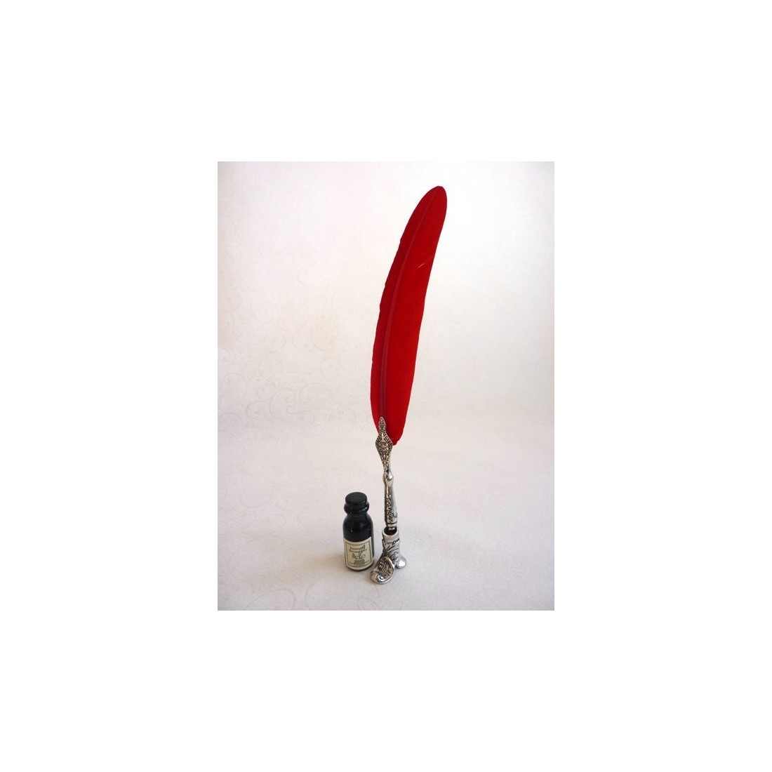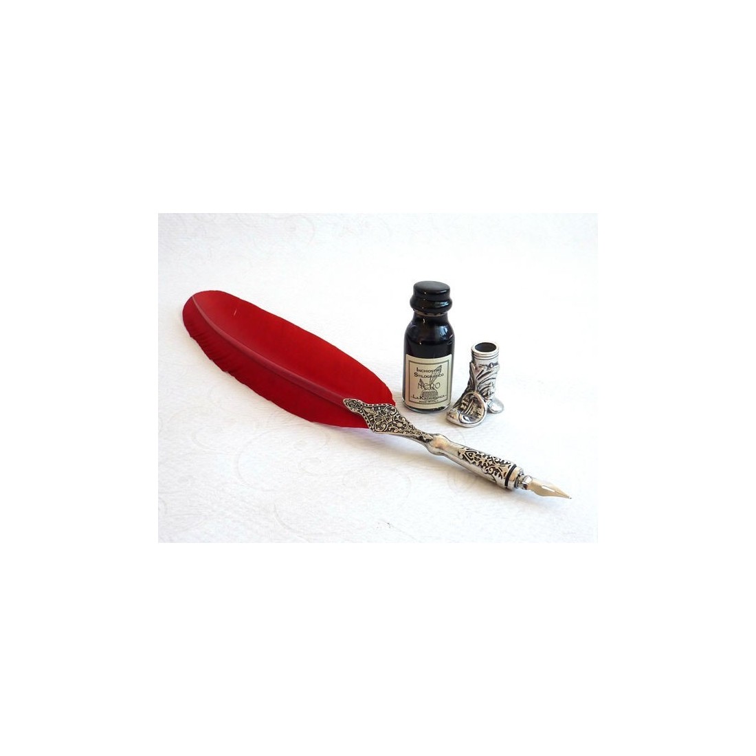 Forbedr din skrivestil med et andet af vores udsmykkede tin kalligrafipennesæt. Dette er en rød gåsefjer med en tinpind. Komplet med en boot-stil penholder og en flaske sort blæk. Lavet i Italien af La Kaligrafica.