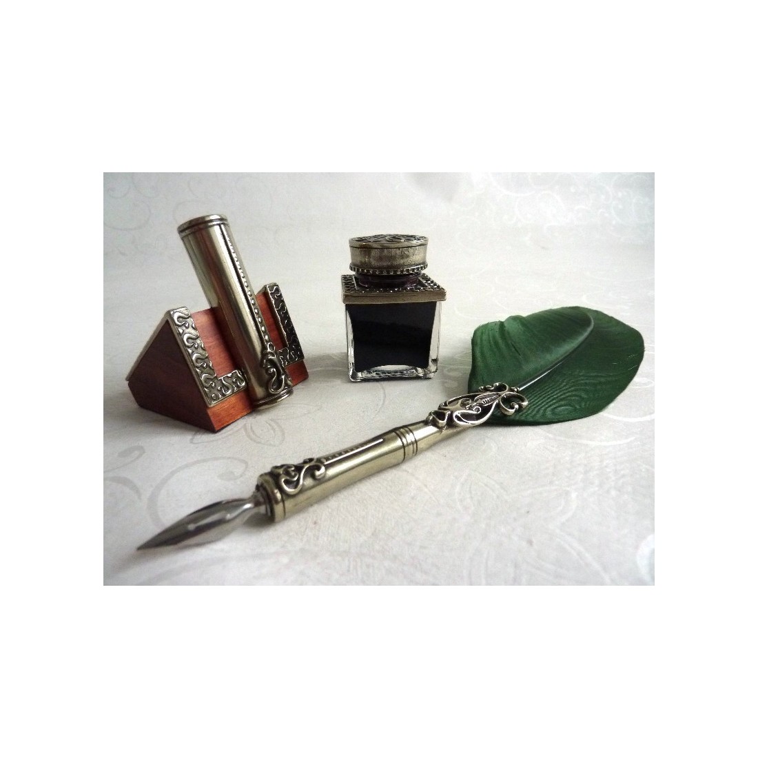 Fjederpenne, blækhus og penholder. Dette sæt består af en gåsefjer-kalligrafipen med bronzespidsholder belagt i nikkel sølv, blækhus og penholder, et pergament med historien om skrivning og en penholder. Nikkel-sølv dekorationen beriger fjerpen, blækhus og penholderen. En elegant gaveide. Ideel til at skrive dine tanker med stil.