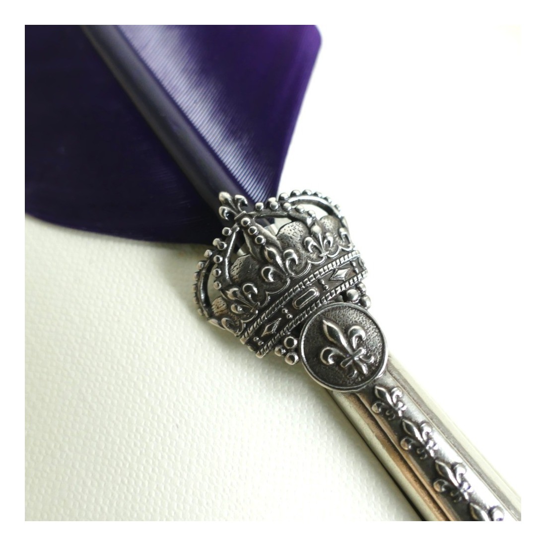 - En håndlavet gås Feather Quill Pen med Fleur-de-Lis kronehåndtag i hvid bronze