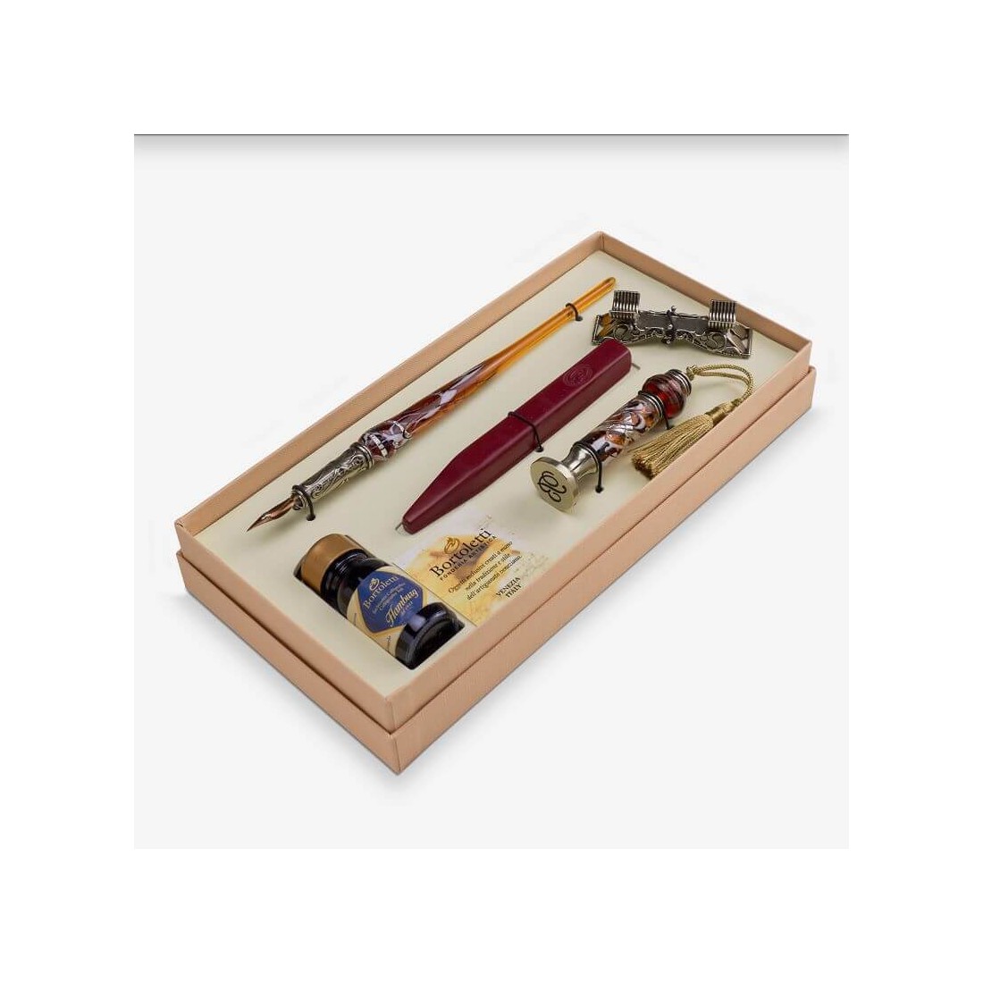 Leopardi kalligrafisættet er et af flagskibene i Bortoletti-kollektionen, og det er let at se hvorfor. Pennen er lavet af højkvalitets Murano-glas, og penneholderen er lavet af håndbearbejdet hvid bronze. Forseglingen er også lavet af Murano-glas, og den kommer med en lang række udskiftelige bogstaver og symboler.