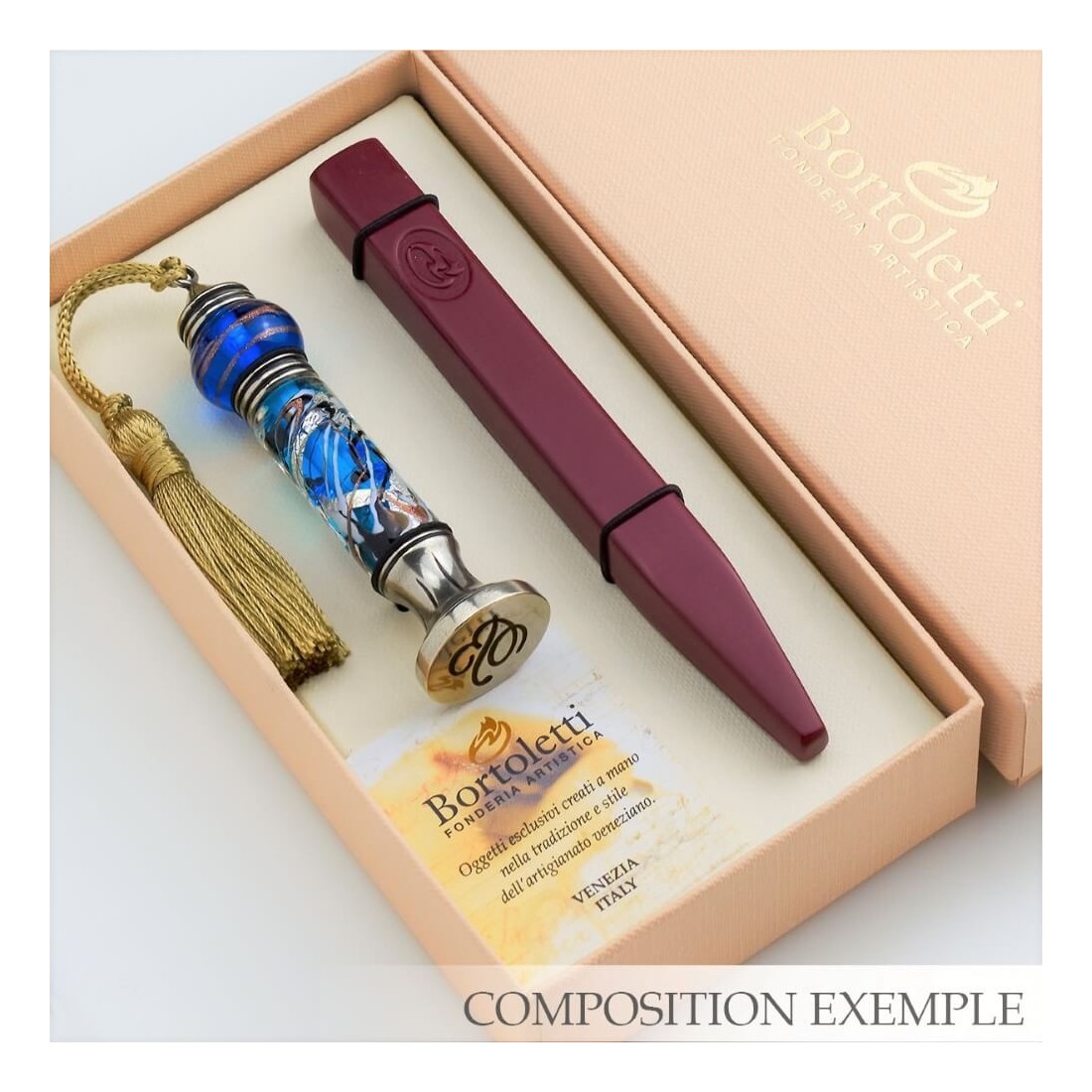 Voksforseglingssæt af glas bestående af en forsegling med én forsegling, en voksstav og en gryde med vokscreme for at fremhæve forseglingen.