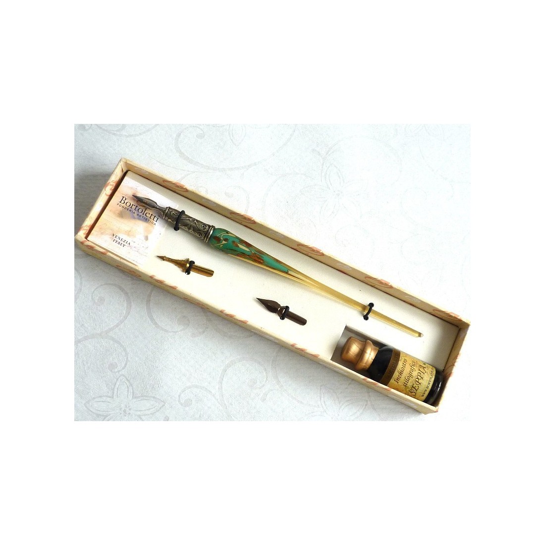 En smukt udformet, hånd færdig, kalligrafi dip pen sæt, som omfatter en Murano glas pen med bladguld flager, tre penne og en flaske blæk. Fås i en række vidunderlige farver.