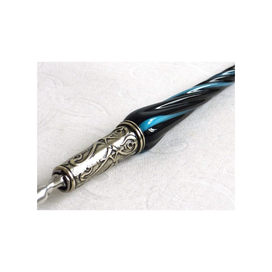 En venetiansk snoet glas pen. Smukt udformet, hånd færdig, kalligrafi pen sat for dem, der elsker den stil og elegance i Venedig. Omfatter en snoet glas aksel med en nikkel sølv pen, tre spidser og en flaske blæk. Fås i en række farver. Fremstillet i Italien af Bortoletti Fonderia Artistica.