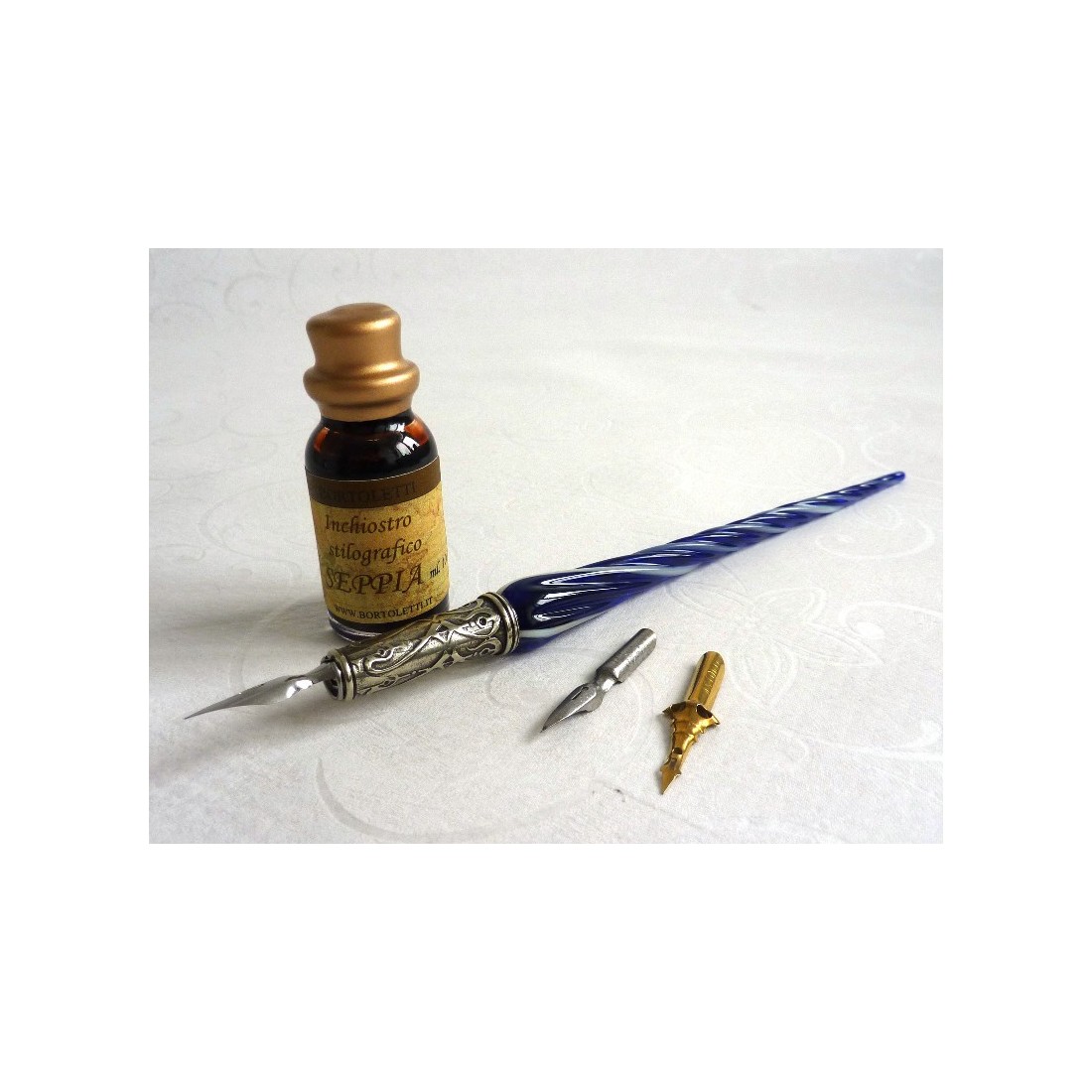 En venetiansk snoet glas pen. Smukt udformet, hånd færdig, kalligrafi pen sat for dem, der elsker den stil og elegance i Venedig. Omfatter en snoet glas aksel med en nikkel sølv pen, tre spidser og en flaske blæk. Fås i en række farver. Fremstillet i Italien af Bortoletti Fonderia Artistica.