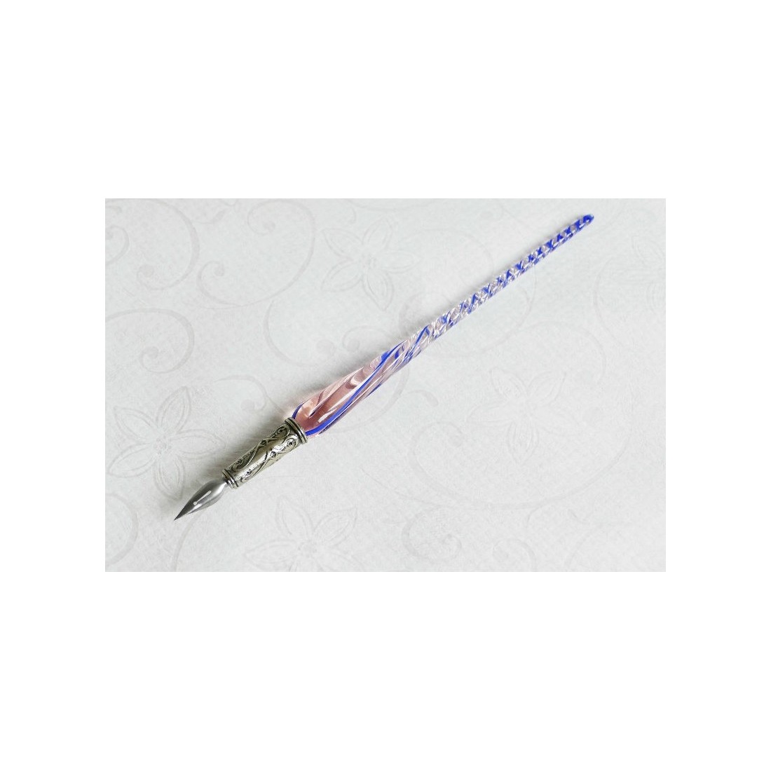 En venetiansk snoet glas pen. Smukt udformet, hånd færdig, kalligrafi pen sat for dem, der elsker den stil og elegance i Venedig. Omfatter en snoet glas aksel med en nikkel sølv pen, tre spidser og en flaske blæk. Fås i en række farver. Fremstillet i Italien af Bortoletti Fonderia Artistica.