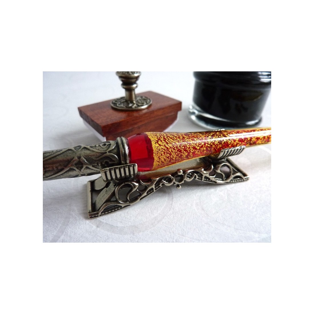 Glas kalligrafi pen bestående Murano-glas pen med bladguld, glas blækhus med bronze ornamenter, blyant og blæk blotter. Klarheden af glasset pennen er udsmykket med bladguld. Under pauser kan du placere den på pen indehaveren, og forbedre din skriftligt med blækket blotter. Original italiensk design.