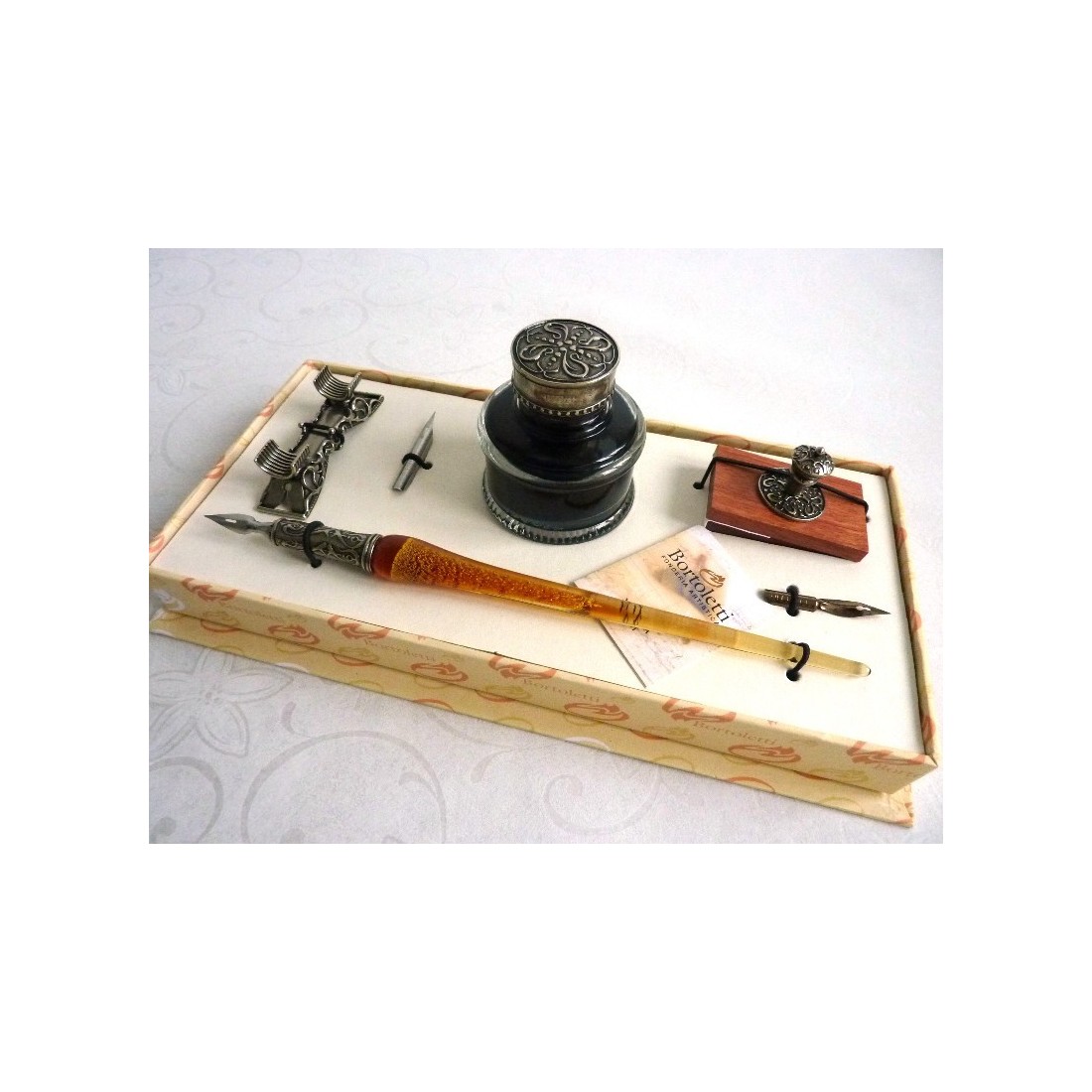 Glas kalligrafi pen bestående Murano-glas pen med bladguld, glas blækhus med bronze ornamenter, blyant og blæk blotter. Klarheden af glasset pennen er udsmykket med bladguld. Under pauser kan du placere den på pen indehaveren, og forbedre din skriftligt med blækket blotter. Original italiensk design.