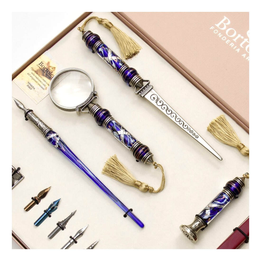 Dette elegante skrivebordssæt er perfekt til kalligrafer og alle, der sætter pris på smukke genstande. Den inkluderer en kalligrafipen i Murano-glas, en brevåbner af hvid bronze, et forstørrelsesglas, et segl og forseglingsvoks i en række forskellige farver. Alle smykker er lavet af materialer af høj kvalitet og er vellavede med sans for detaljer.