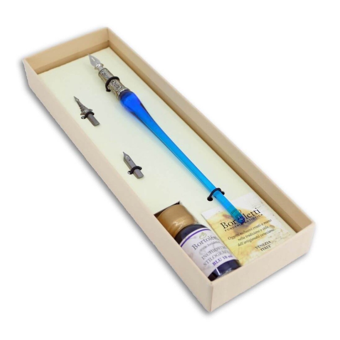 En almindelig glas kalligrafipen, lavet af Murano-glas og forniklet sølvfarvet bronze. Komplet med to ekstra spidser og en 10 ml flaske vandbaseret blæk. Vælg mellem ni vidunderlige glasfarver.