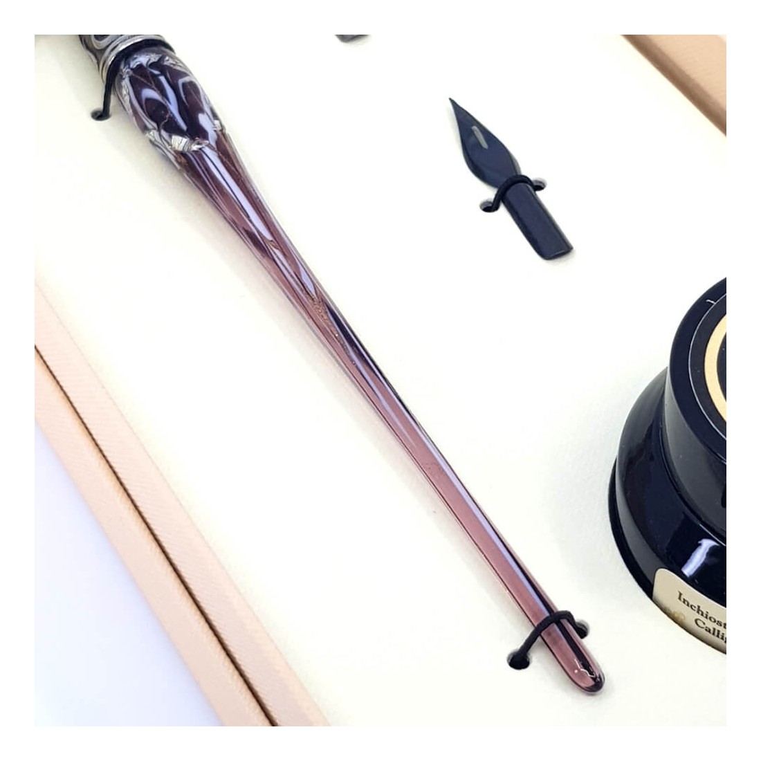 Et smukt udformet, håndforarbejdet, kalligrafi-dyppepensæt, som består af en Murano-glaspen med sølvbladsflager, tre spidser og en flaske blæk.