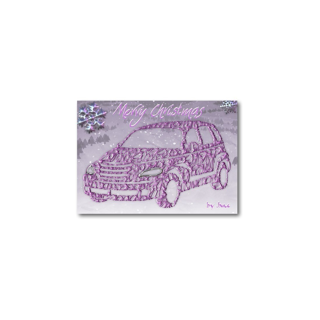 En jul Chrysler PT Cruiser med ord og sætninger om bilen og navnet på PT Cruiser. Disse kommer i blå eller lilla på fantastiske snedækkede baggrunde. Chrome-effekt omkring forlygten.