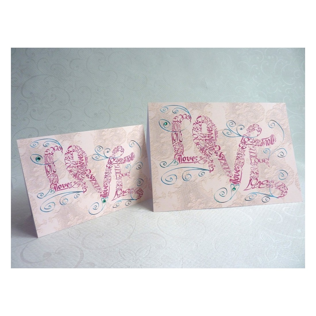 En klassisk version af vores andet ægte kalligrafikort. Elegant rød bogstaver danner ordet 'Kærlighed' omgivet af flydende hvirvler, cirkler og diamanter.