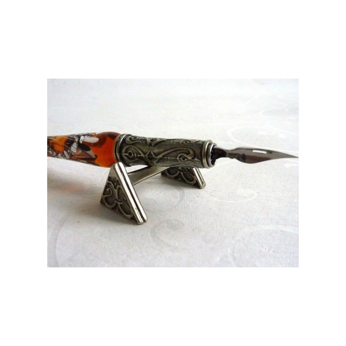 En behagelig seng til din elskede pen, lavet i fint arbejdede nickle sølv. En lille perle af design og håndværk, denne pen resten er unik.