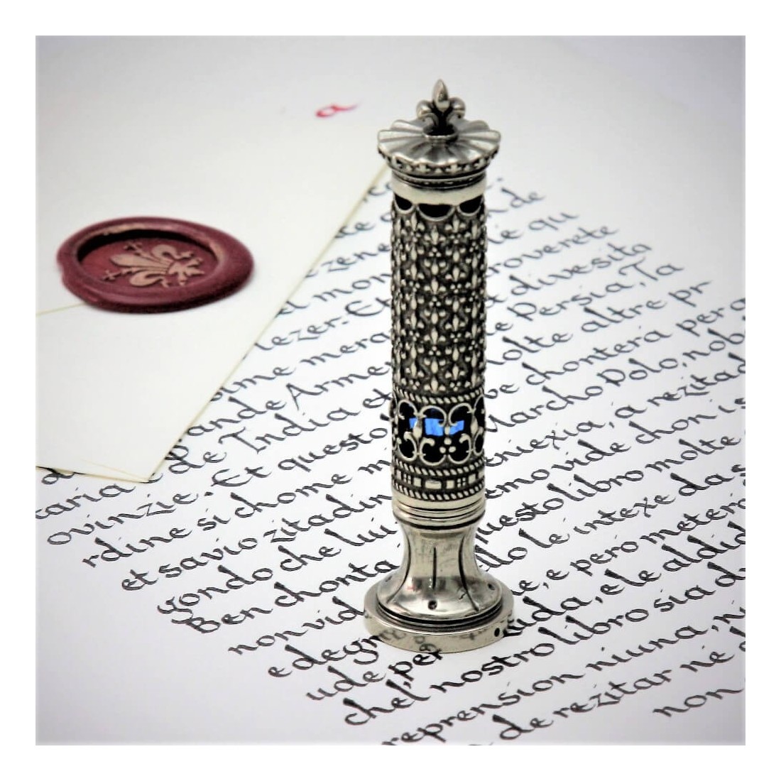 Corona voksforseglingen blev lavet fuldstændig i hånden af Bortoletti-håndværkere af hvid bronze støbt af tabt voks og mejslet i hånden som en ægte juvel. En havvandsfarvet glasstang er indlejret indeni.