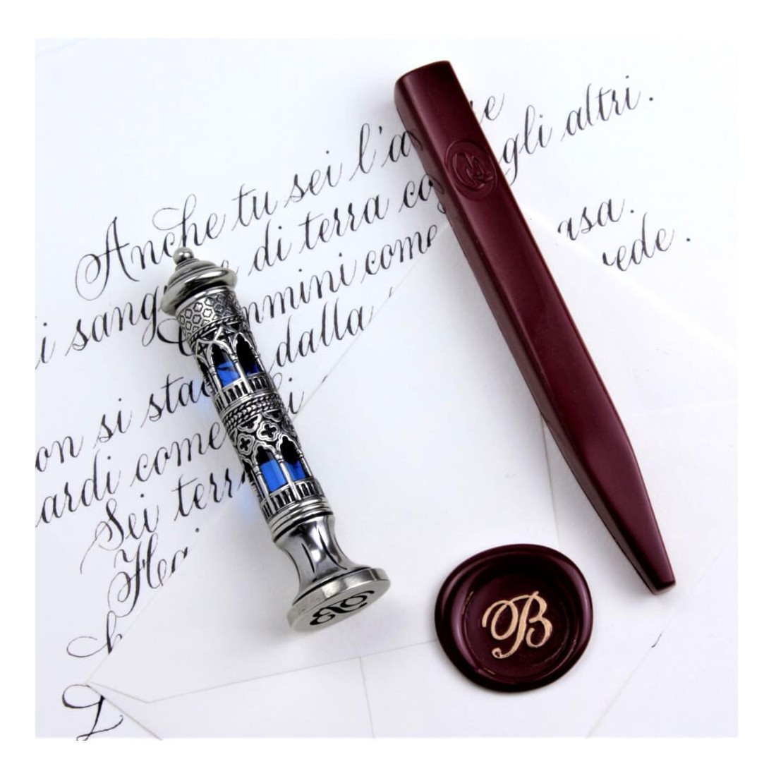 Ca d'Oro voksstemplet fås med en række bogstaver, initialer og symboler, så du kan tilpasse det efter din smag. Du kan også vælge mellem over 40 farver forseglingsvoks for at skabe en helt unik forsegling.