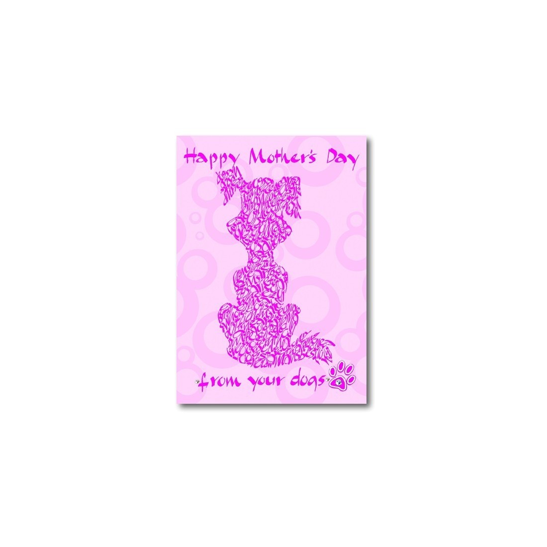 Mere end én hund? Så prøv dette kort. Glad mors dag fra dine hunde. En dejlig, håndlavet kort med en hund konstrueret ved hjælp af kalligrafi i ord, sætninger og citater om menneskets bedste ven. Tre vidunderligt forskellige designs at vælge imellem.