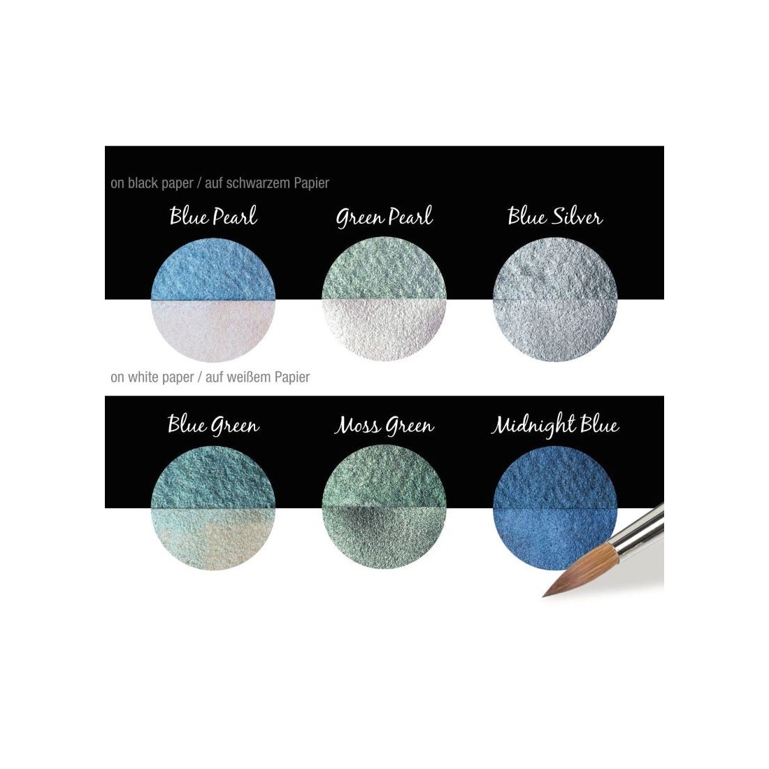Lavet af glimmer, et naturligt mineral, der tilbyder en bred vifte af metalliske nuancer, fra guld og sølv til iriserende, skinnende perle farver. Aktiver med lidt vand på paletten og gælder for nib med en pensel. Hæfter på alle absorberende overflader, såsom papir, træ, gips, etc.