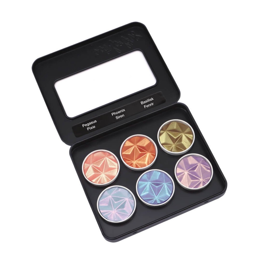 Metalkasse indeholdende Pearlcolors 'Pegasus', 'Phoenix', 'Basilisk', 'Pixie', 'Siren' og 'Fenrir.' Disse perlefarver vises i forskellige nuancer afhængigt af belysningen og farven på papiret.