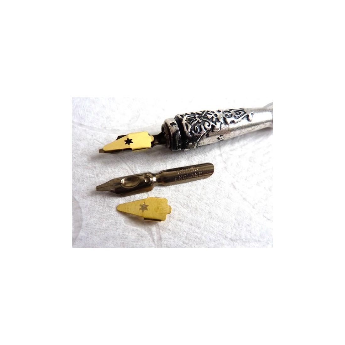 Runde Hand kalligrafi penne og reservoirer. En stål kalligrafi nib for begyndere og eksperter både. Messing reservoir gør det muligt at skrive mere med mindre dypning af pennen i blækhus. Fremragende for begyndere, når du bruger vores kalligrafi startpakker. Fås i forskellige størrelser. 0 er den største størrelse og 6 er den mindste størrelse. Fremstillet af Manuskript i Det Forenede Kongerige.