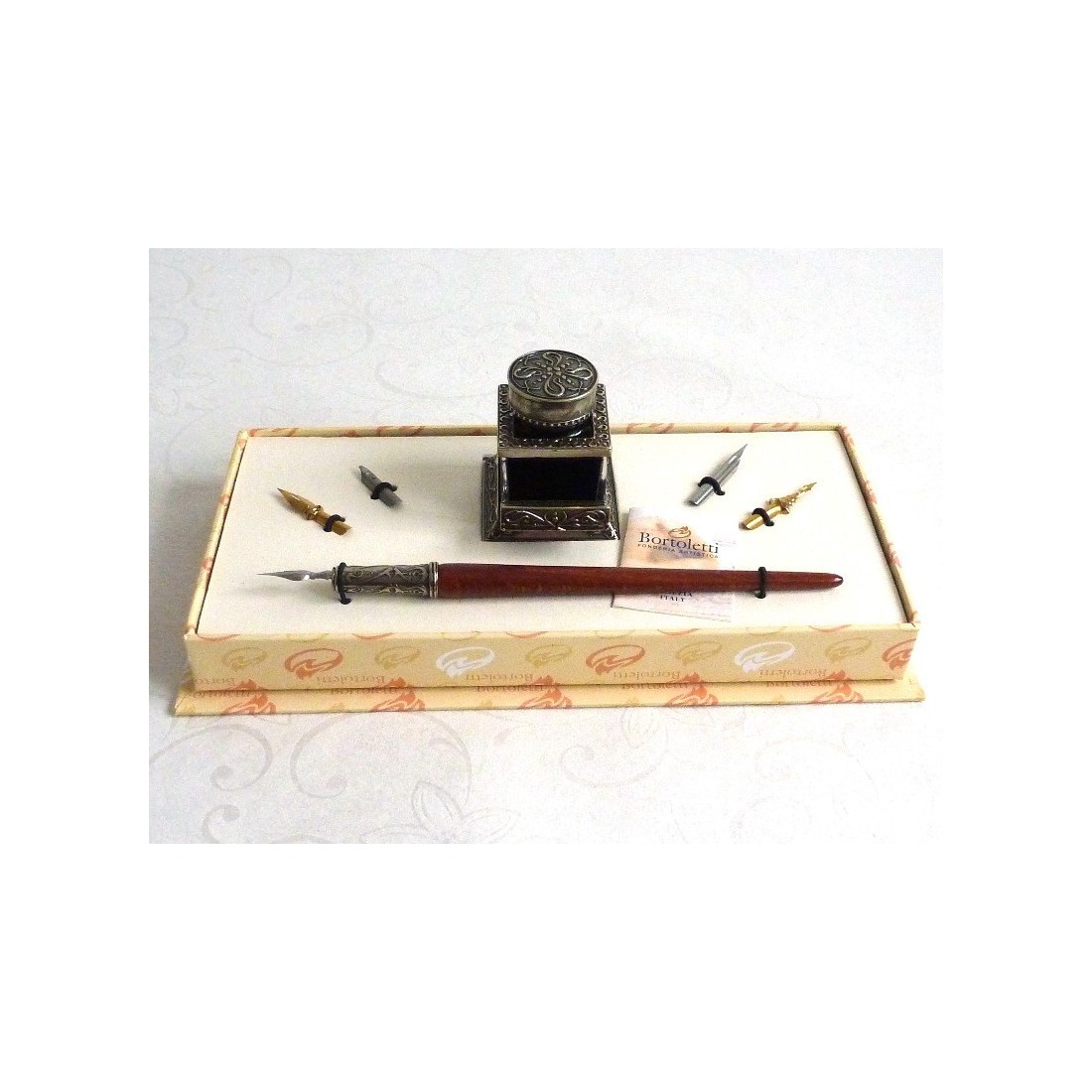 Træ kalligrafi pen sæt med blækhus og pen hvile. Stor værdi og raffinement. Sættet består af en træ pen med bronze nib holder forgyldt i nysølv, blækhus og fire antikke spidser. En lille mesterværk af design. Glasset blækhus er indrettet med nysølv og har en support, hvor du kan placere kalligrafi pen under en pause mellem tanker. Dette sæt skal tilfredsstille selv de mest krævende forfattere.