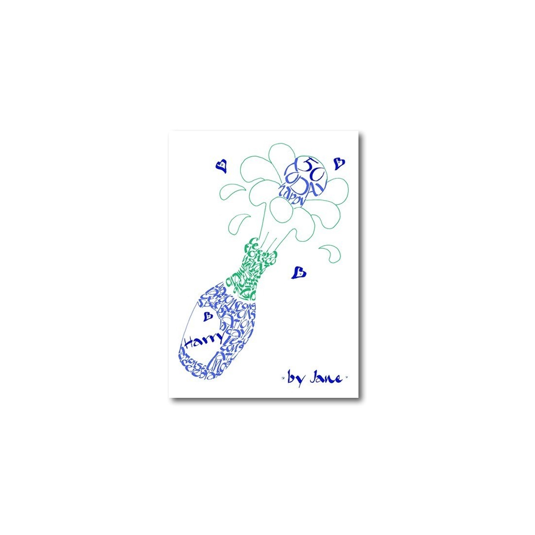 Eine einzigartige, handgemachte Karte. Eine Champagnerflasche, die mit einem Namen auf dem Etikett und dem Alter im Korken personalisiert werden kann. Entworfen mit Kalligraphie in Wörtern und Phrasen, die besondere Zeiten feiern. Diese wunderschöne, handgemachte Karte hat Diamanten, die zu beiden Seiten des Textes am unteren Rand der Karte und in jedem der Herzen platziert sind. Glitter hebt den Champagner hinter dem knallenden Korken für einen besonderen Glanz hervor !!