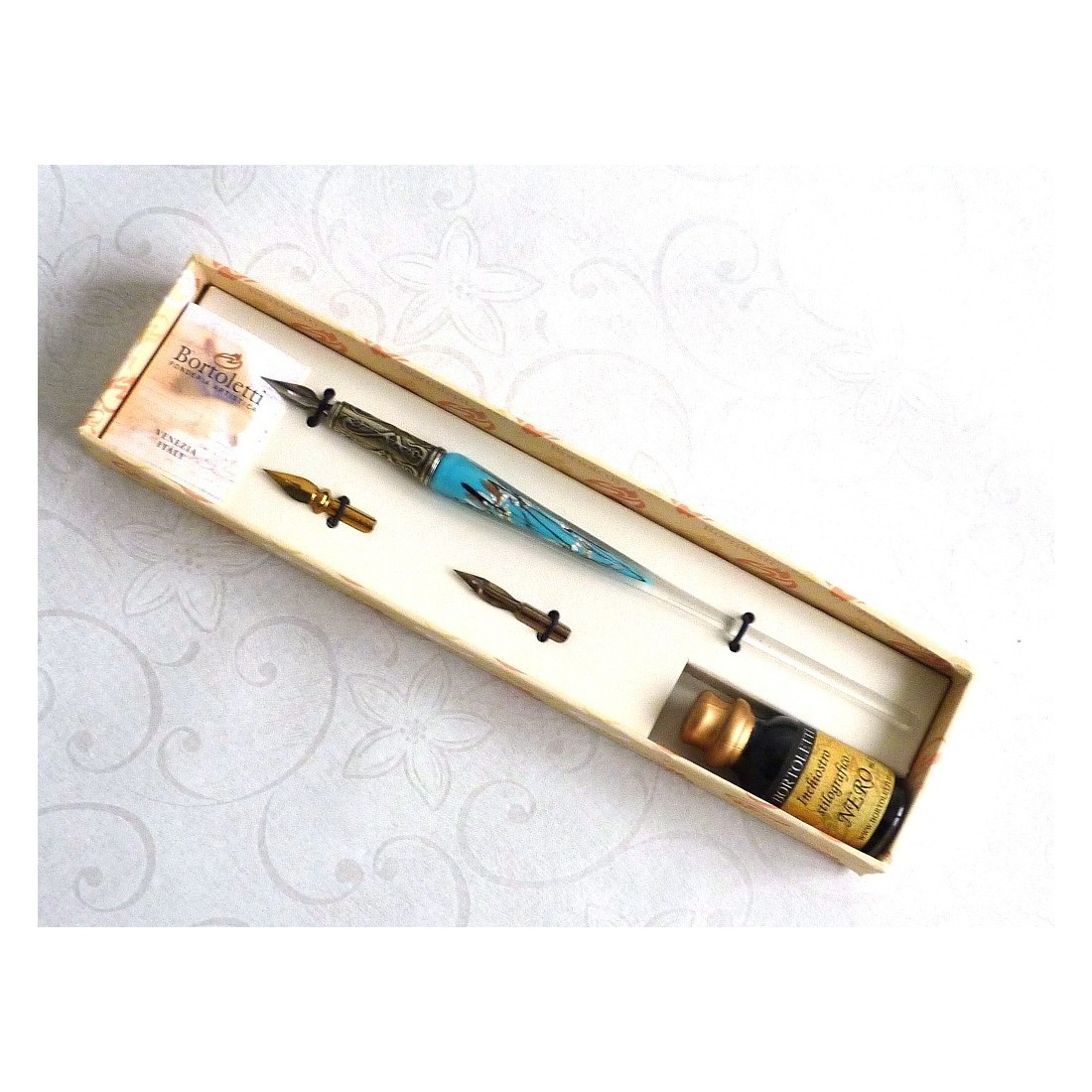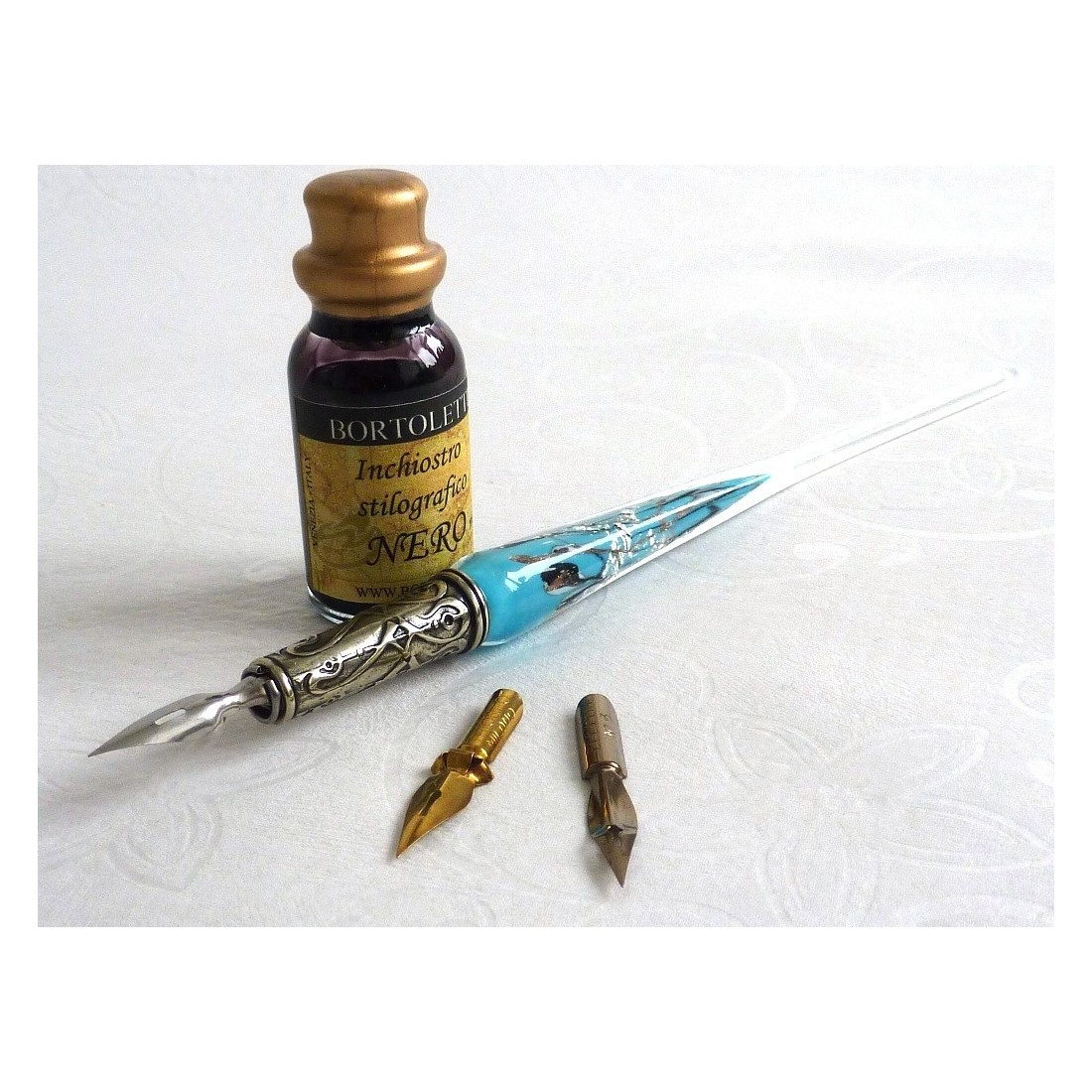 Blattsilber und Glas Pen-Set. Eine schön gestaltete, handgefertigt, Kalligraphie Dip-Pen-Set, das eine Glasfüller mit Blattsilber Flocken, drei Schreibfedern und eine Flasche Tinte. Erhältlich in einer Reihe von wunderbaren Farben. Made in Italy von Bortoletti Fonderia Artistica.