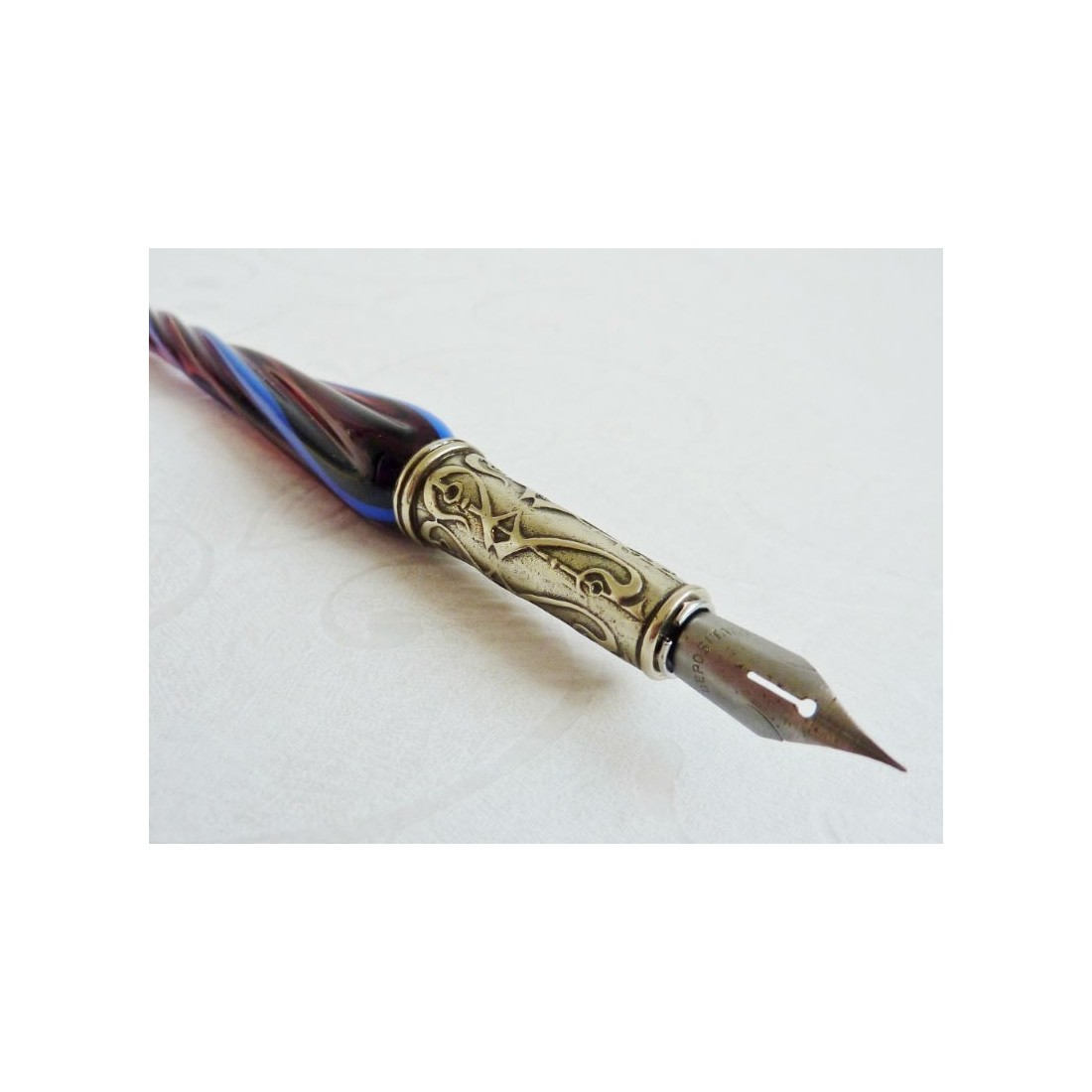 Eine schön gestaltete, handgefertigt , Kalligraphie Dip-Pen für diejenigen setzen, die den Stil und die Eleganz von Venedig lieben. Besteht aus einer verdrehten Glasschaft mit einem Nickel-Silber-Stift, drei Spitzen und einer Flasche Tinte. In einer Reihe von wunderbaren Farben.