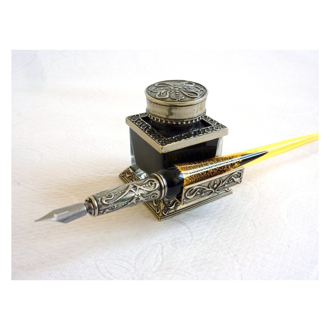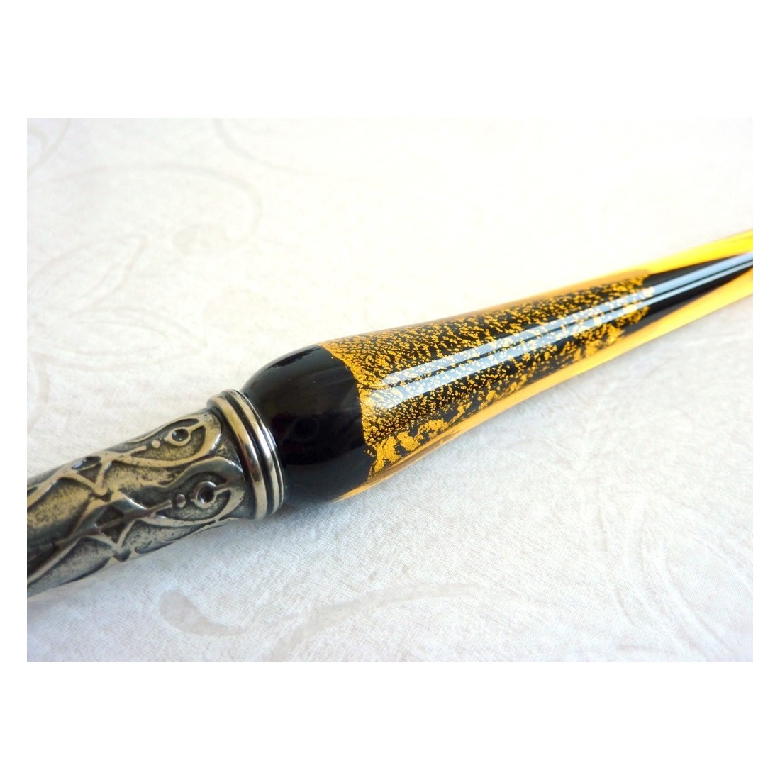 Eine schön gestaltete, handgefertigt, Kalligraphie Dip-Pen mit Murano-Glas und Blattgold gesetzt. Eine Glas & Nickel versilbert, bronze Dip-Pen, vier Schreibfedern und eine verzierte Tintenfass. Erhältlich in einer Reihe von wunderbaren Farben.