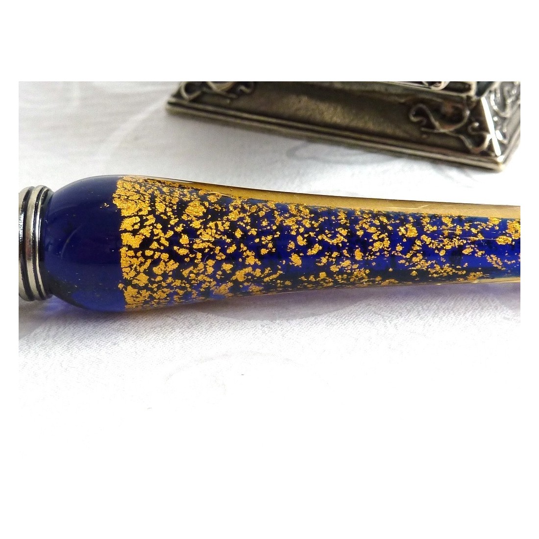 Eine schön gestaltete, handgefertigt, Kalligraphie Dip-Pen mit Murano-Glas und Blattgold gesetzt. Eine Glas & Nickel versilbert, bronze Dip-Pen, vier Schreibfedern und eine verzierte Tintenfass. Erhältlich in einer Reihe von wunderbaren Farben.