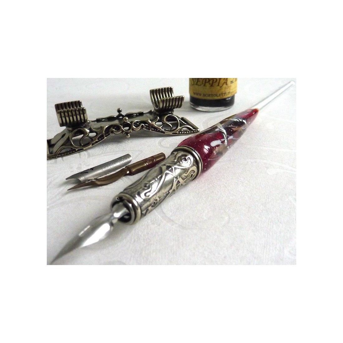 Silber Blatt und Glas Dip Pen. Ein handgemachter, handgefertigter Kalligraphie-Tauchfeder-Set mit Muranoglas und Silberblatt. Bestehend aus einem Glas & Nickel versilbert, Bronze Dip Pen, drei Federn und einem kunstvollen Stift Rest. Erhältlich in verschiedenen Farben. Hergestellt in Italien von Bortoletti Fonderia Artistica.