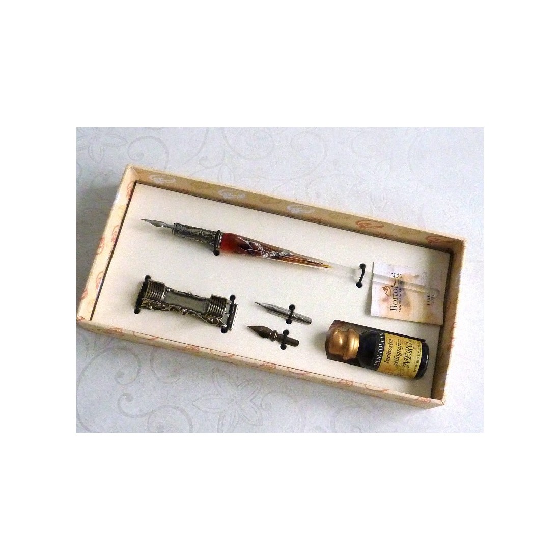 Silber Blatt und Glas Dip Pen. Ein handgemachter, handgefertigter Kalligraphie-Tauchfeder-Set mit Muranoglas und Silberblatt. Bestehend aus einem Glas & Nickel versilbert, Bronze Dip Pen, drei Federn und einem kunstvollen Stift Rest. Erhältlich in verschiedenen Farben. Hergestellt in Italien von Bortoletti Fonderia Artistica.