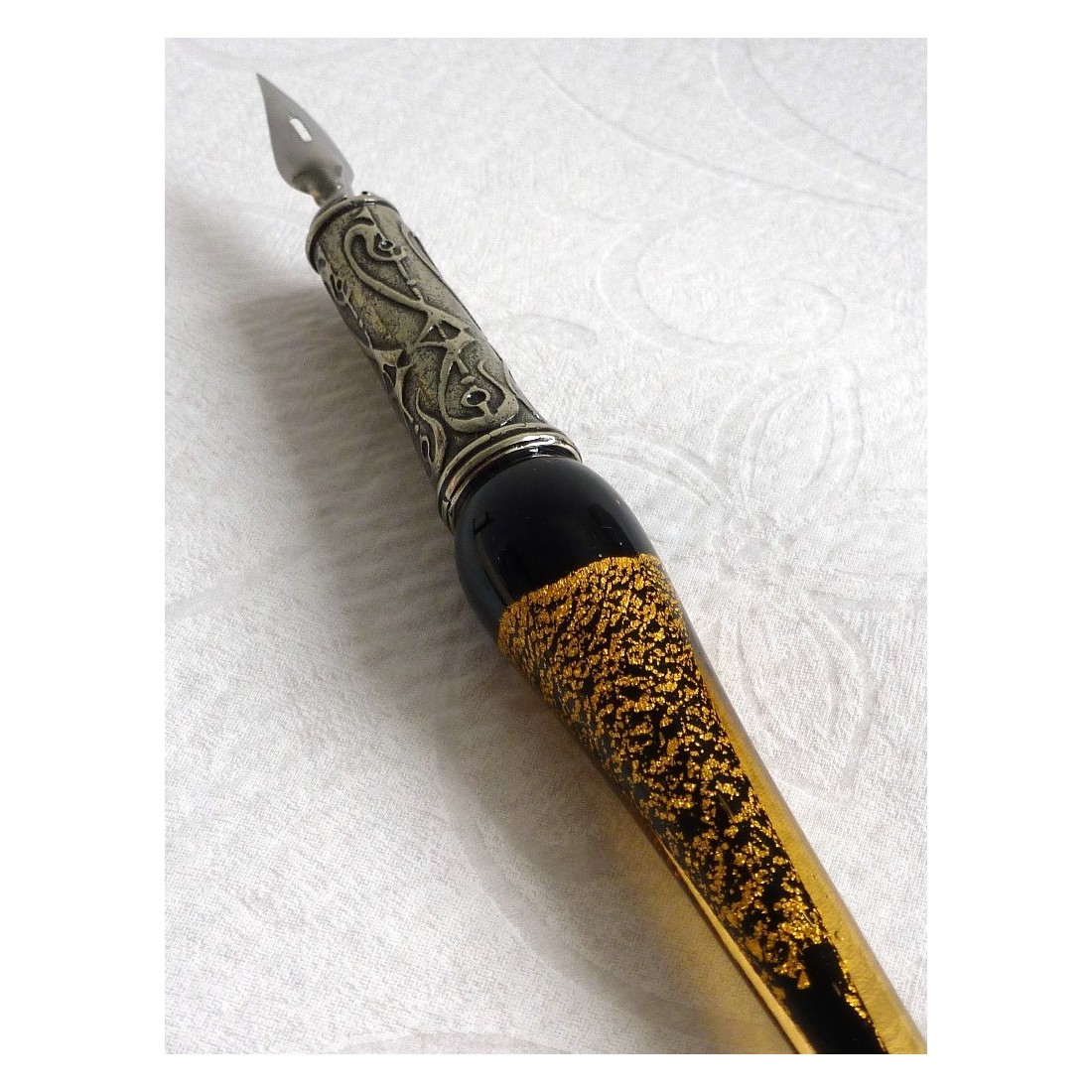 Ein wunderschön gefertigtes, handgefertigtes Kalligraphie-Dip-Pen-Set. Besteht aus einem Murano-Glasstift mit Blattgoldflocken, drei Spitzen und einer Flasche Tinte. Erhältlich in einer Reihe wundervoller Farben.