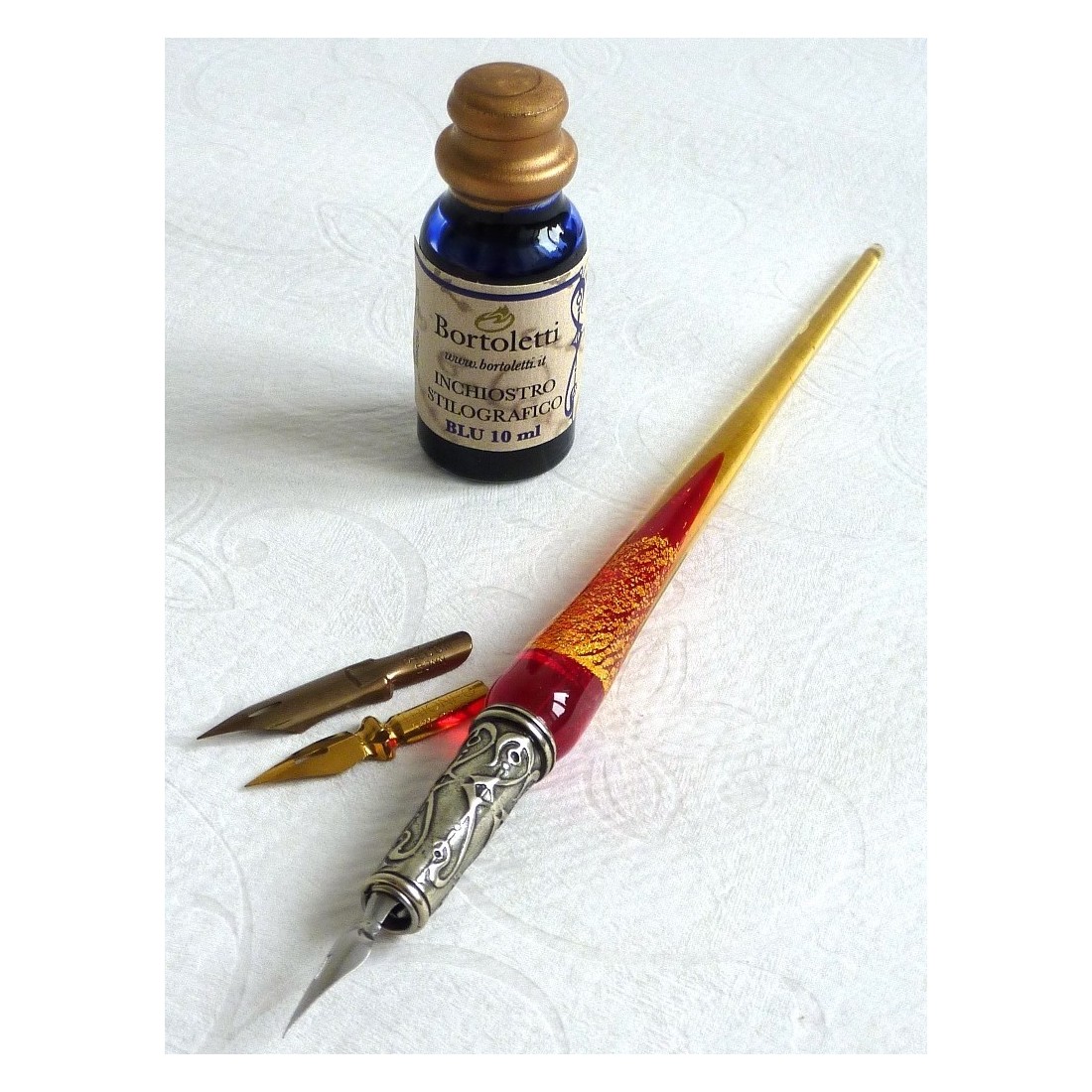 Ein wunderschön gefertigtes, handgefertigtes Kalligraphie-Dip-Pen-Set. Besteht aus einem Murano-Glasstift mit Blattgoldflocken, drei Spitzen und einer Flasche Tinte. Erhältlich in einer Reihe wundervoller Farben.
