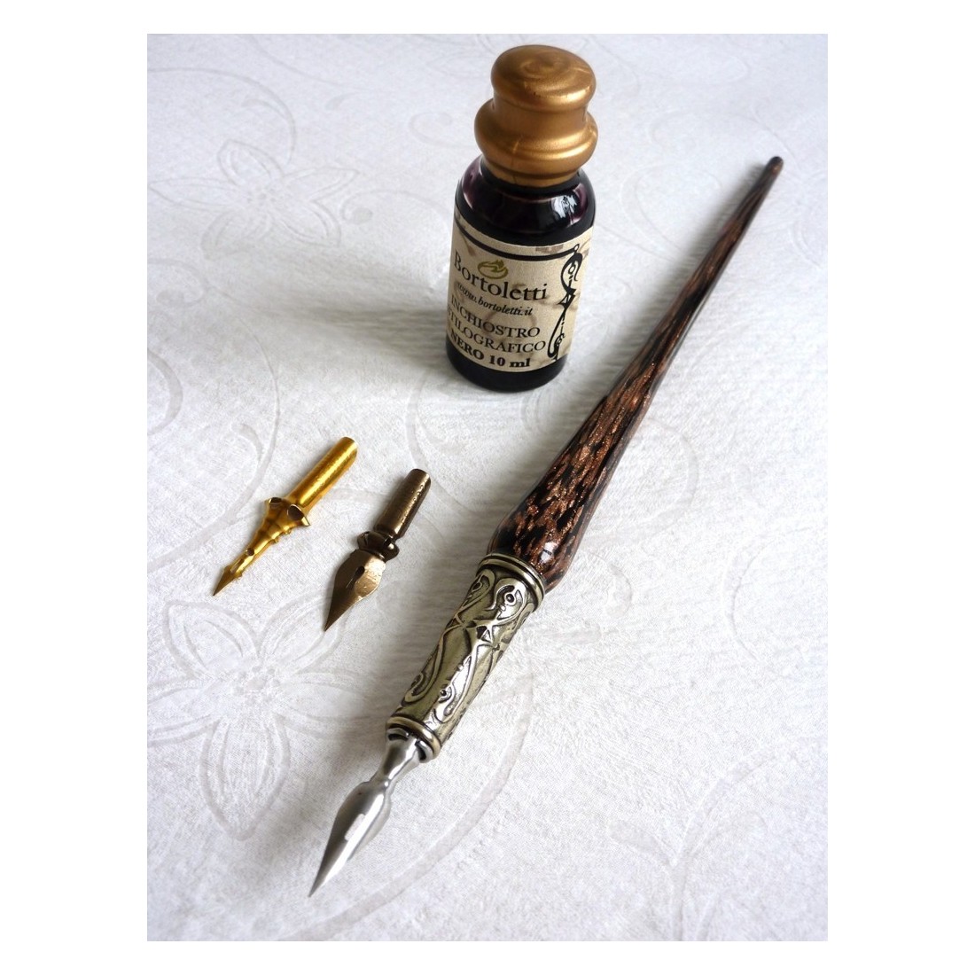 Kupferkristalle & Glasstiftset. Ein wunderschön gefertigtes, handgefertigtes Kalligraphie-Dip-Pen-Set, bestehend aus einem Murano Aventurin-Quarzglasstift, eingebettet in Kupferkristalle. Ebenfalls enthalten sind drei Federn und eine Flasche Tinte. Erhältlich in einer Reihe wundervoller Farben.
