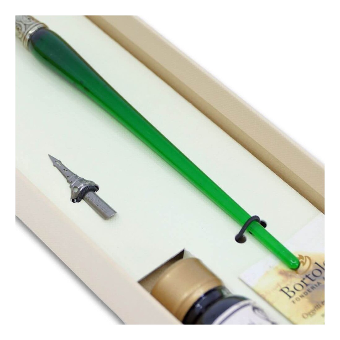Ein einfacher Kalligraphiestift aus Muranoglas und nickelsilberbeschichteter Bronze. Komplett mit zwei zusätzlichen Federn und einer 10-ml-Flasche Tinte auf Wasserbasis. Wählen Sie aus neun wunderschönen Glasfarben.
