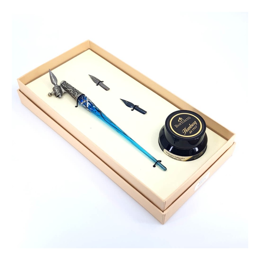 Ein wunderschön gearbeitetes, handgefertigtes Kalligrafie-Tauchstift-Set, bestehend aus einem Muranoglas-Stift mit Blattsilberflocken, drei Spitzen und einer Flasche Tinte.