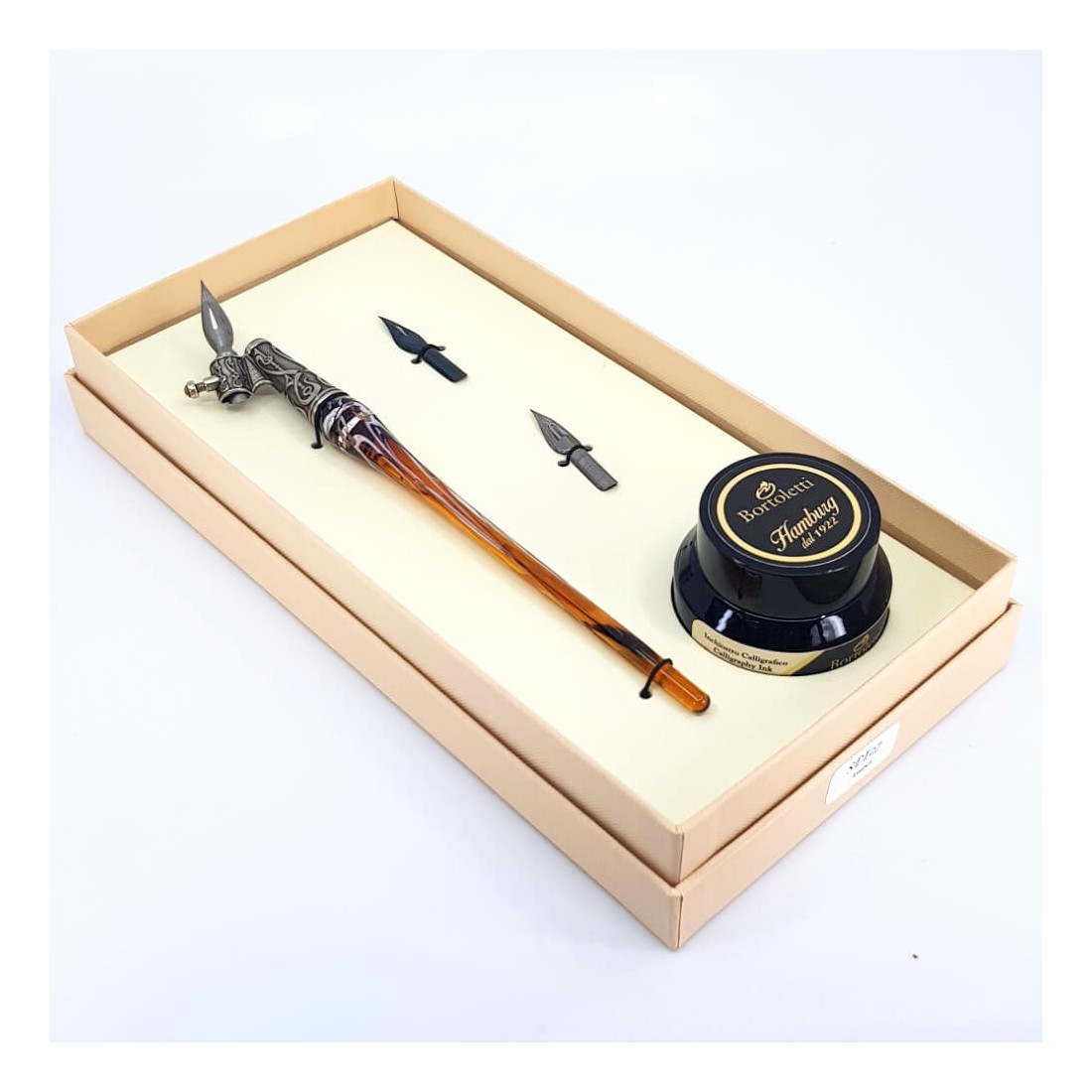Ein wunderschön gearbeitetes, handgefertigtes Kalligrafie-Tauchstift-Set, bestehend aus einem Muranoglas-Stift mit Blattsilberflocken, drei Spitzen und einer Flasche Tinte.