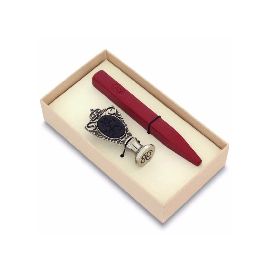 Wachssiegel-Set bestehend aus einem Bronzesiegel und einer Glaskamee, die den Heiligen Georg und den Drachen darstellt. Ein Siegel, ein Siegelwachsstab und ein Töpfchen Wachscreme. Die Dichtung und der Griff sind in Neusilber ausgeführt.