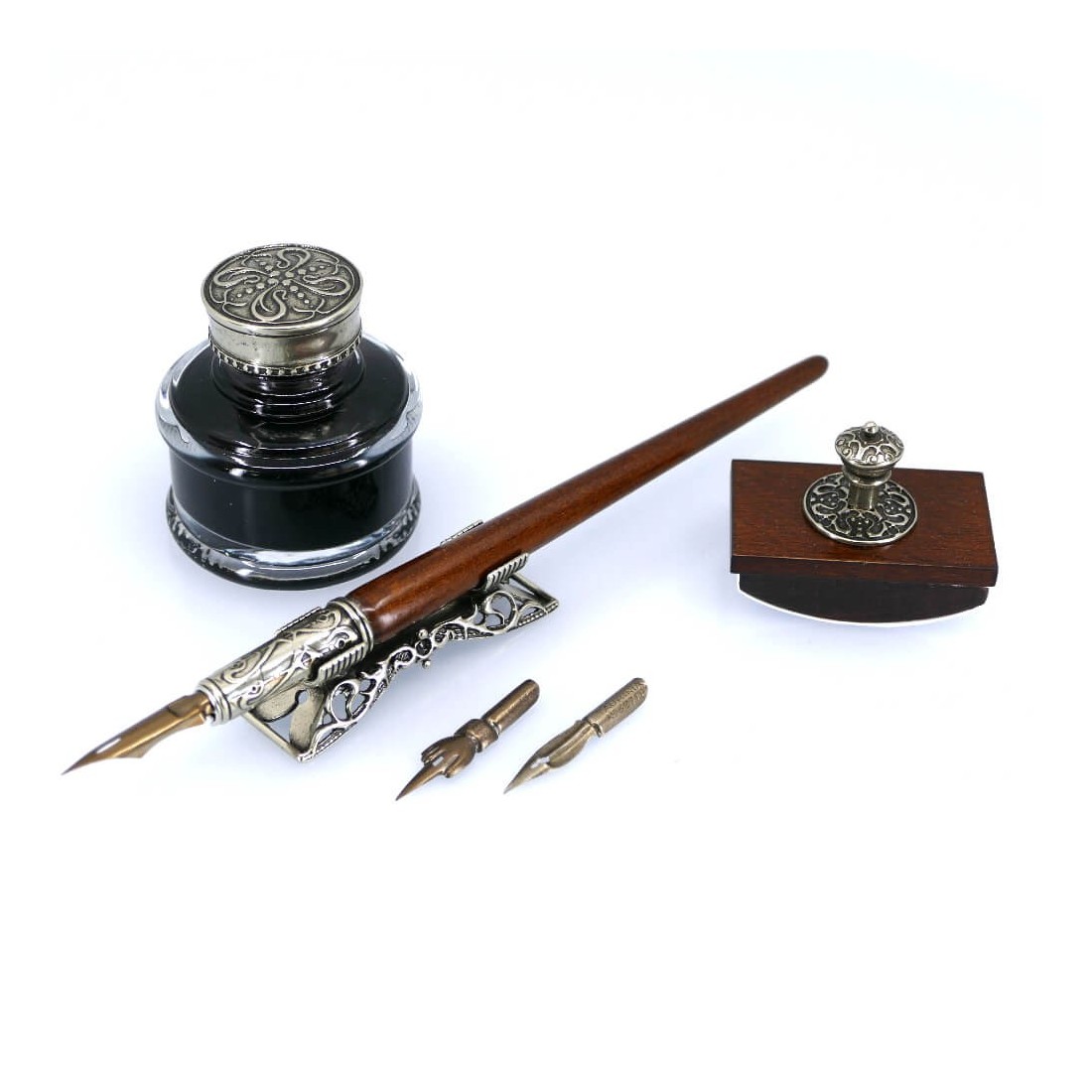 Tolles Preis-Leistungs-Verhältnis! Ein großartiges Schreibset bestehend aus einem Kalligraphie-Dip-Stift aus Holz, einem 40-ml-Tintenfass aus Glas mit schwarzer Tinte, einem Bronzestifthalter, einem Löschpapier und drei antiken Schreibfedern.