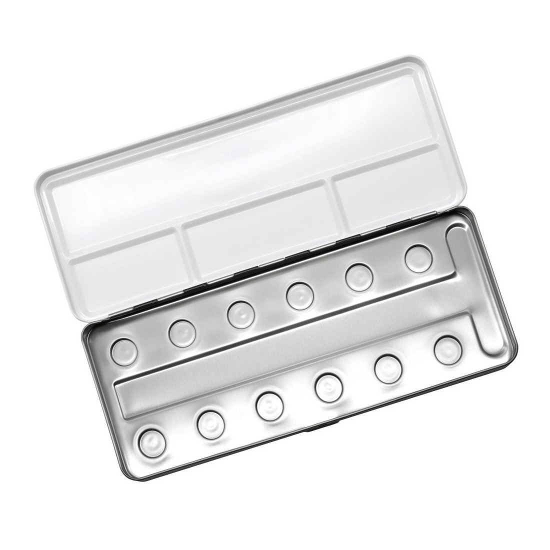 Verwenden Sie diese Metallbox, um eine eigene Palette von zwölf zu erstellen Coliro Perlenfarben aus unserem Shop. Nützlich zum Speichern Ihrer Mischpinsel und einer Stiftruhe. Der Deckel fungiert auch als Palettenmischungsfach.