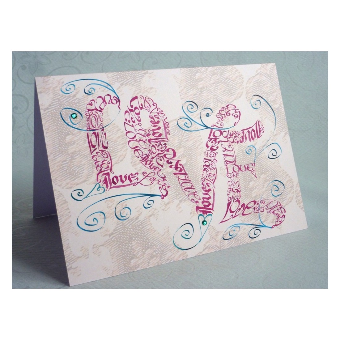 Eine klassische Version unserer anderen echten Kalligraphiekarte. Elegante rote Schrift bildet das Wort "Love", umgeben von fließenden Wirbeln, Kreisen und Diamanten.