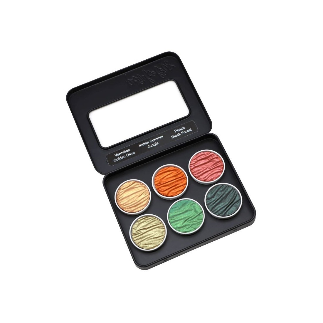 Sechs Perlenfarben mit 30 mm Durchmesser in einer Metallbox. Enthält folgende Farbtöne: