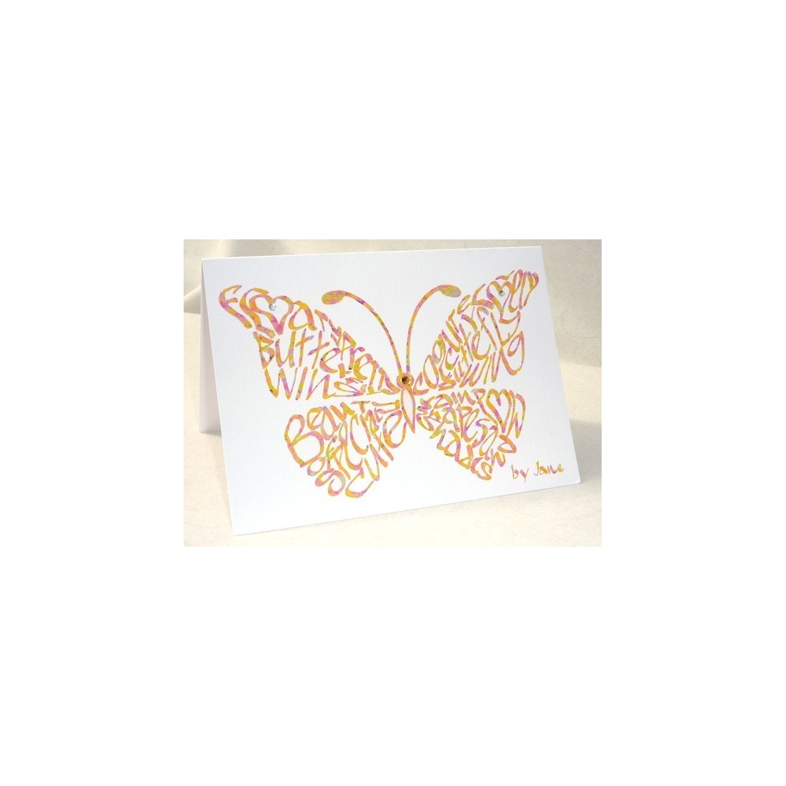 Eine helle und schöne Konfetti farbige Schmetterling, kalligraphische Grußkarte. Diamantes markieren Sie die Flügelspitzen und Kopf. Der Körper und die Antenne haben beide Glitter aufgebracht zu bringen, eine besonderen Glanz. Diese wunderschöne Schmetterling Design spiegelt die zarte Schönheit unserer Sommergarten geflügelten Freunde.