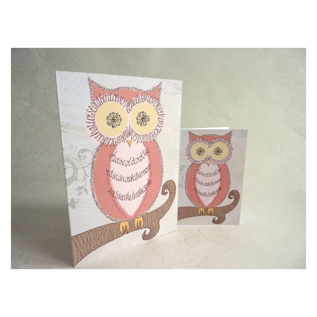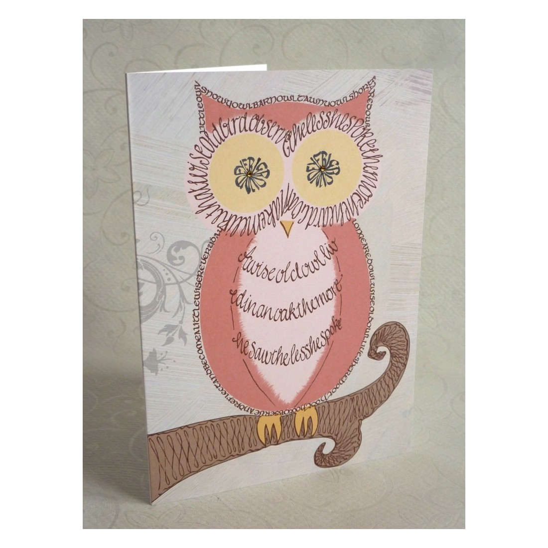 Kluge Eule. Kalligraphische Grußkarte. Eine wunderbar gestaltete Karte, in der Kalligraphie mit Vintage-Farben gestaltet, zeigt eine weise alte Eule sitzt auf dem Ast eines Baumes. Diamantes werden auf der Karte platziert, um seine Augen funkeln.