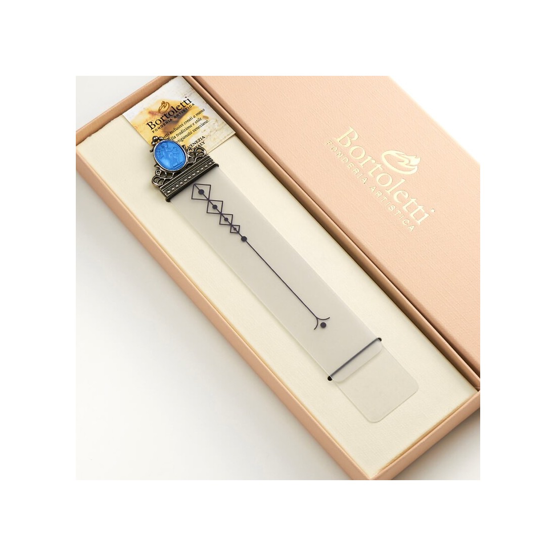 The handmade bookmark is for an tasteful audience that is the result of Bortoletti and his master jewellers' continuous research in the field of design. The processing of glass paste is unique and passed down through generations of Murano’s master glassmakers.