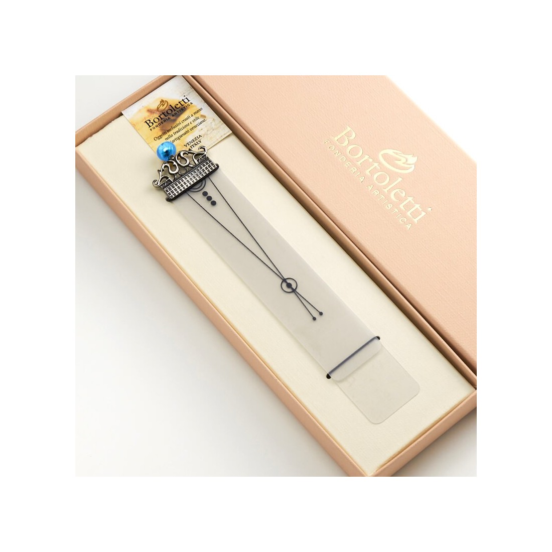Bookmark with white bronze decoration embellished with a coloured Murano glass pearl bead to keep the mark. Fire, Murano glass and the hands of our master craftsmen are the generating energy of our products.