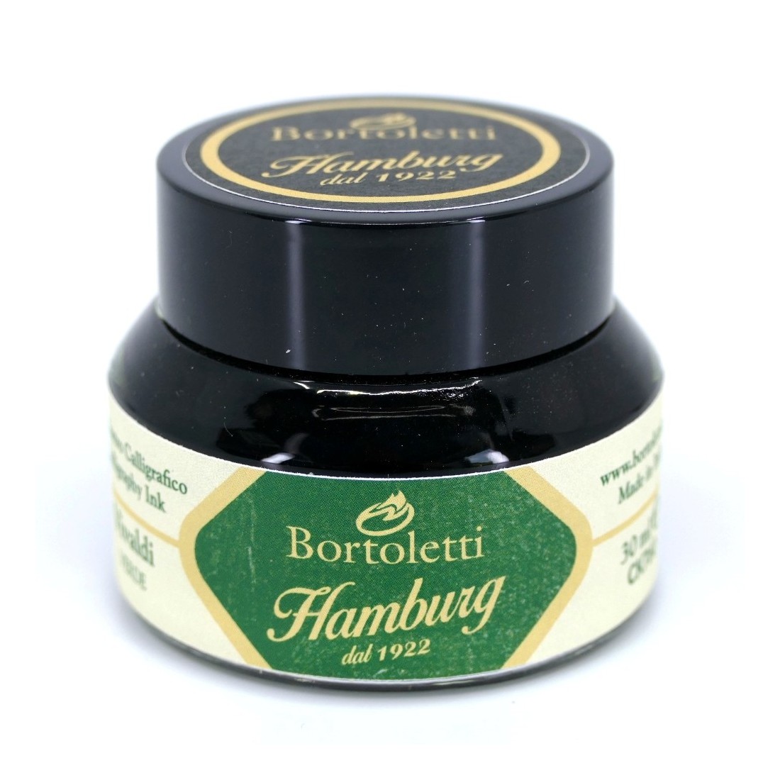 A bottle of green Italian calligraphy ink (30ml), supplied by Bortoletti. Vivaldi is an ink that carries the energy of Brilliant Green; a homage to the force of nature that the Italian composer was able to celebrate best in his “Four Seasons”.