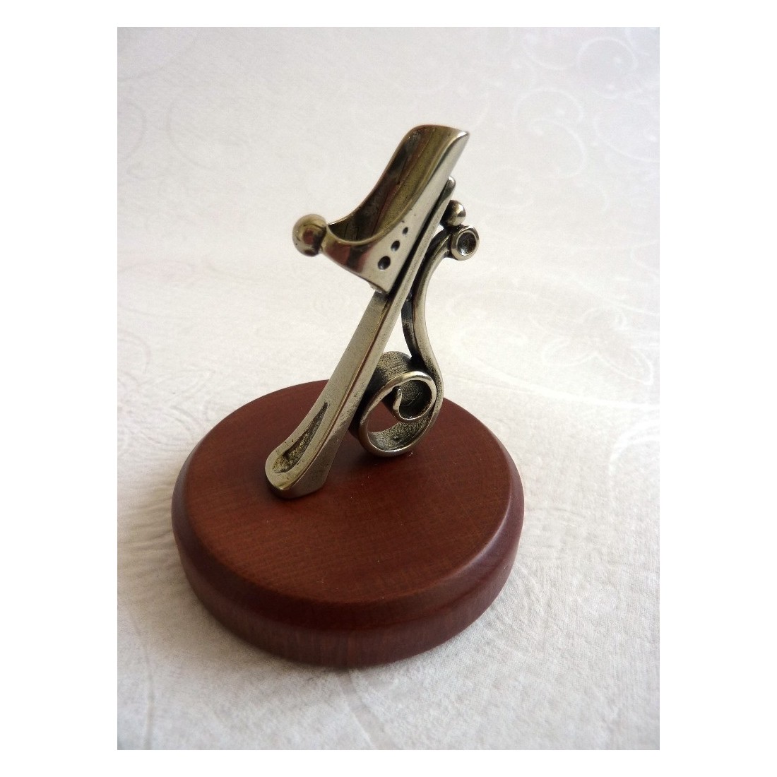 The simplicity of the decorations is combined with the expressive strength of the materials. This pen holder is made from wood and finely worked nickle silver. There are two versions. One for a Glass or Wooden pen. The other is designed for a Feather pen. Both styles are elegant pieces, that confer personality to your writing desk.