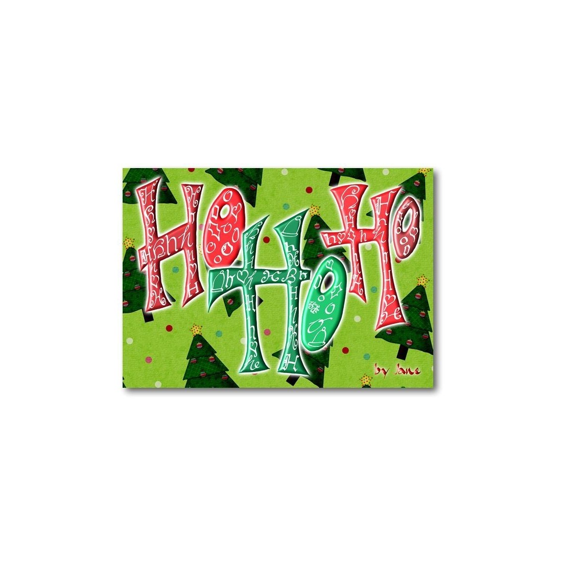 Here's a cheery card - you can almost hear Santa himself! Bright green and red letters are highlighted with calligraphic small letters. Placed on a background of Christmas trees.