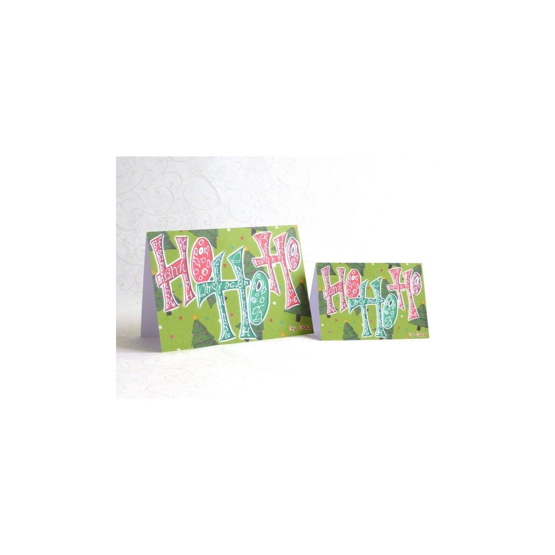 Here’s a cheery card - you can almost hear Santa himself! Bright green and red letters are highlighted with calligraphic small letters. Placed on a background of Christmas trees.